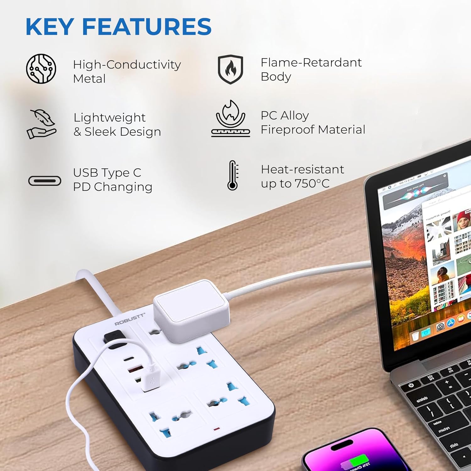 Robustt 4‑Outlet Extension Board with 3 USB & 1 Fast Charging Type-C Port | 1.7 m Cable | Wall Mountable Extension Board with On/Off Switch | 2500W Multi Plug Extension Cord for Home & Office