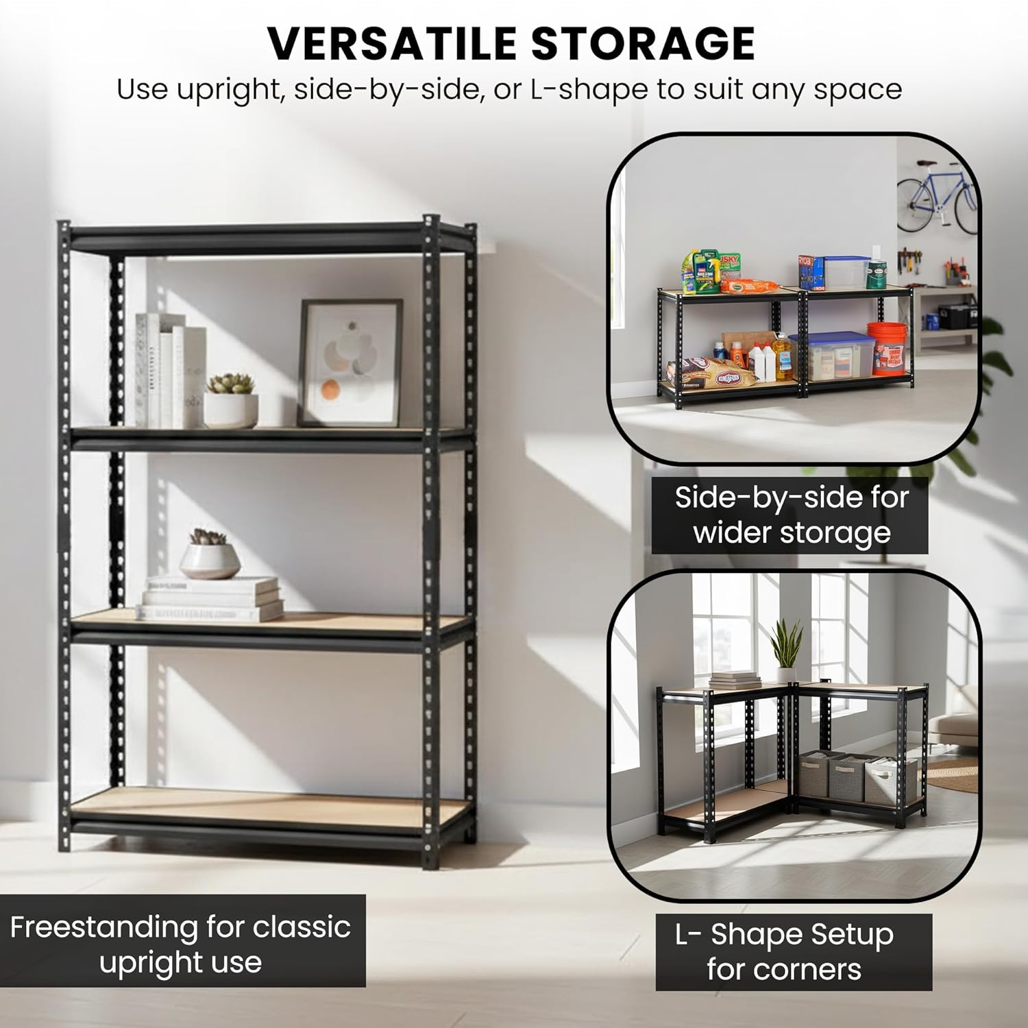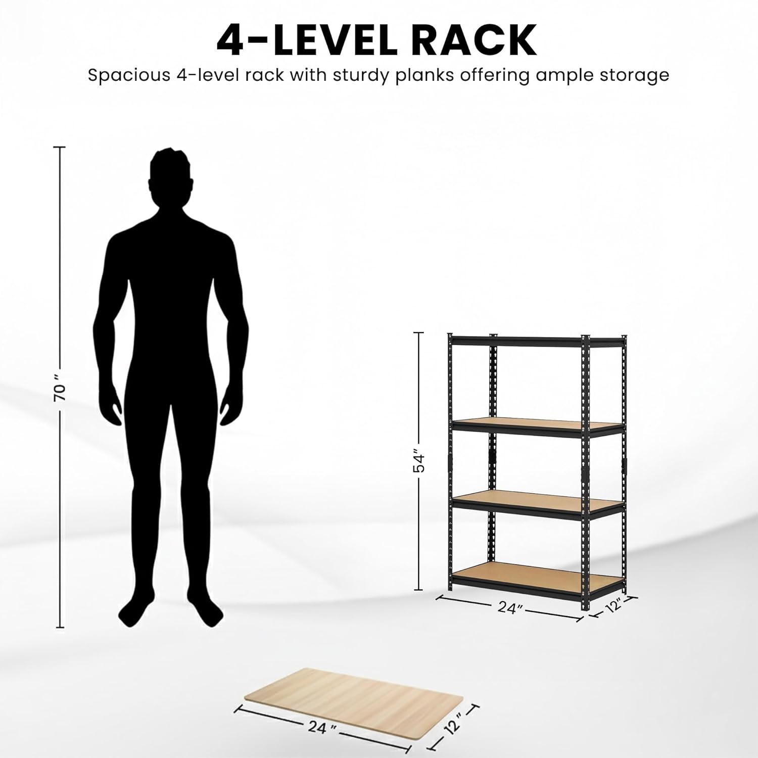 Robustt 4-Tier Multipurpose Storage Rack | Bolt-Free Assembly | Galvanized Metal | Thick MDF Board | 175kg Capacity Per Shelf | 54 x 24 x 12 Inches Adjustable Shelf Rack for Home, Garage & Shop | Black