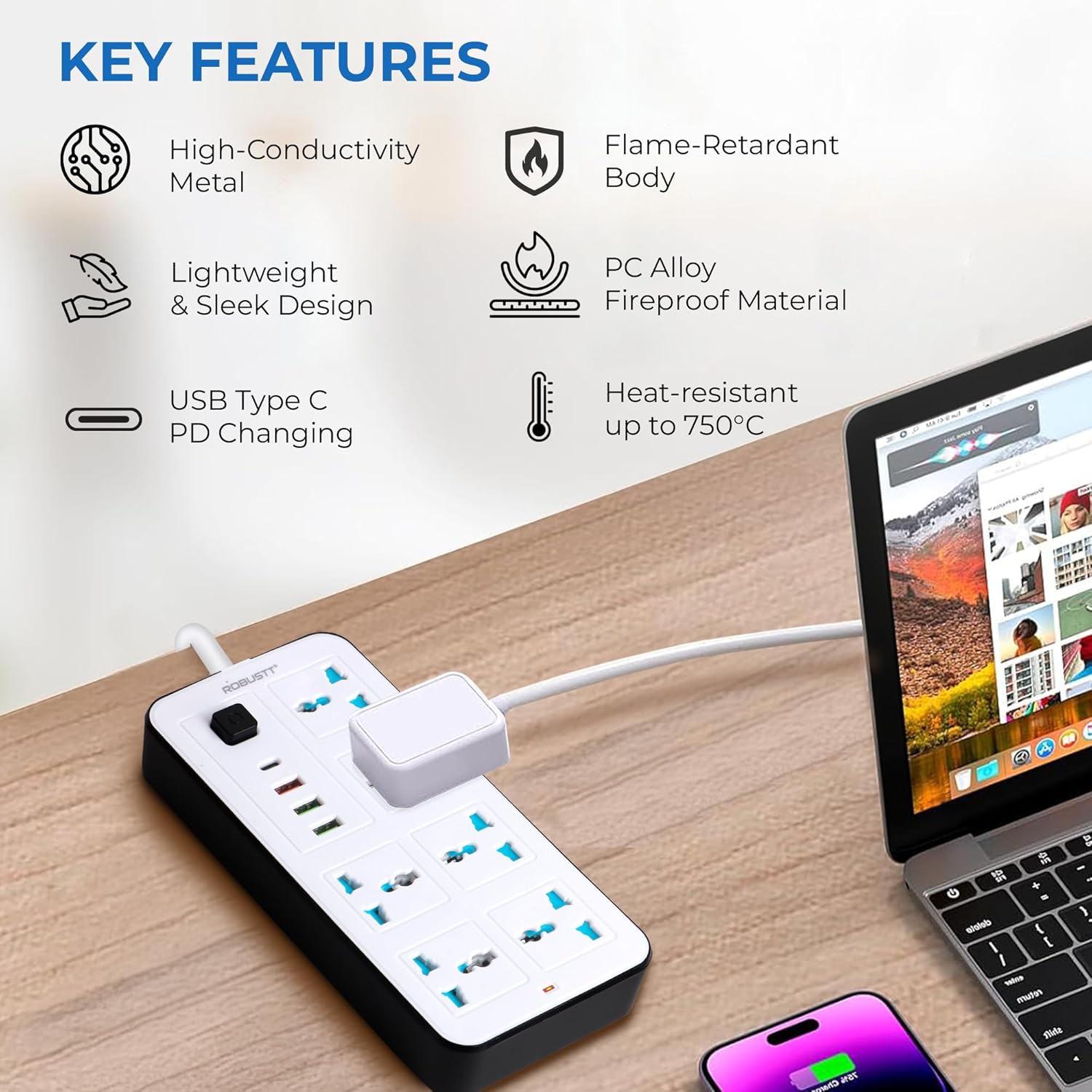 - High-Conductivity Metal Components: Inside, the extension box uses high-conductivity metal that ensures efficient power flow with minimal resistance. This helps reduce energy loss, prevents heat buildup, and supports stable performance even when multiple devices are connected.