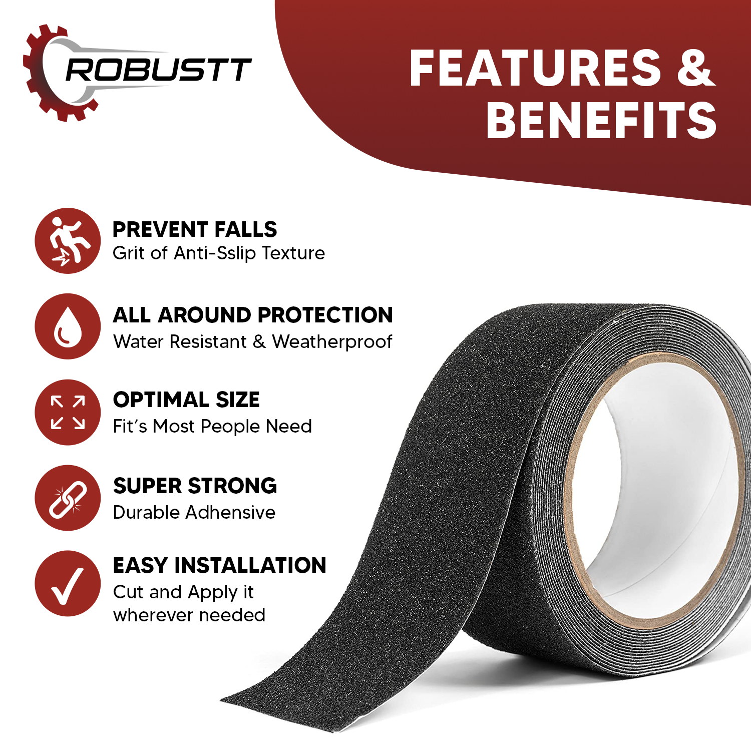 Introducing Robustt Safety Tape – your simple and durable solution for a safer environment. Designed to provide extra foot traction, especially in slippery conditions, it reduces the risk of slips, trips, and falls. Ideal for various settings, including homes and public spaces, this Anti-Slip tape offers long-lasting protection for young children, pregnant women, patients, pets, and guests. Unlike other non-slip tapes, Robustt adheres firmly, even in high-traffic areas. Easy to apply, cut, and maintain, it transforms any surface into a secure zone. Prioritize safety with Robustt – where confident steps meet lasting protection.