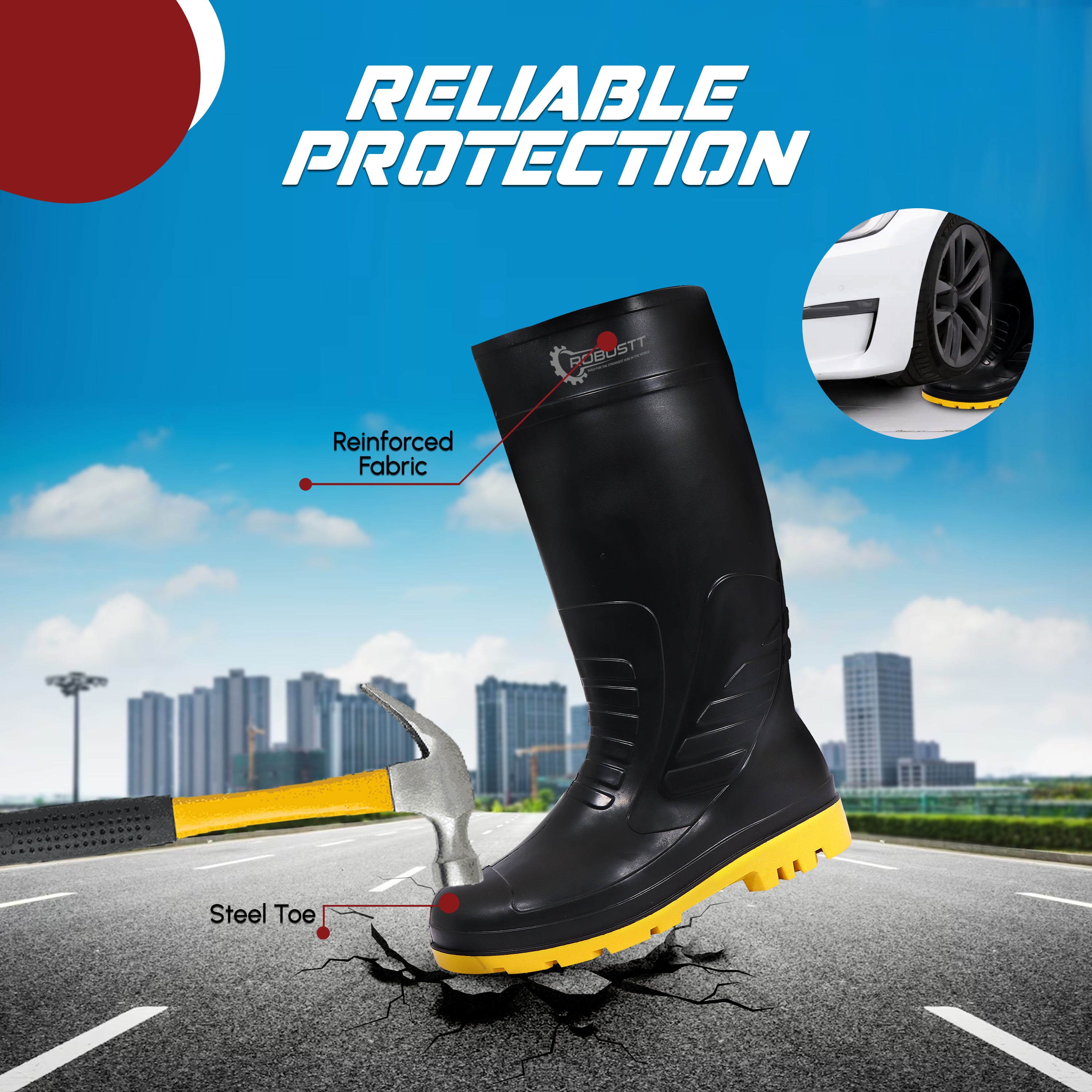 Robustt Steel Toe Lightweight Gum Boots, Standard Steel Safety Shoes, Anti Slip, Waterpoof, Breathable Printed Leather Shoes, Puncture and Tear Resistant, for Industrial Use (Yellow)