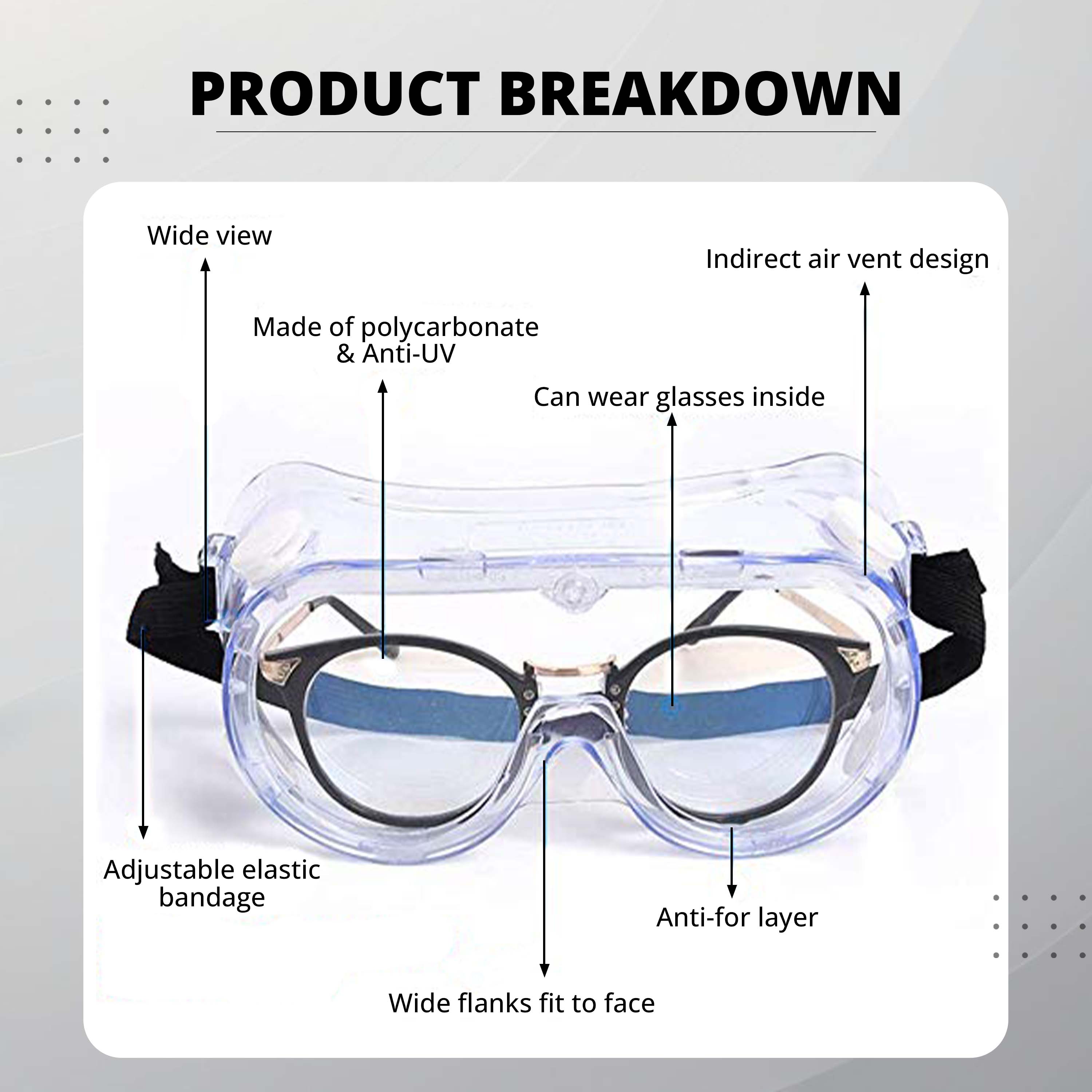 Designed to withstand the rigors of your work, our safety goggles feature anti-scratch lenses, ensuring long-lasting clarity for optimal performance. With a clear lens and wide vision design, you'll experience unparalleled visibility, allowing you to tackle tasks with confidence and precision.