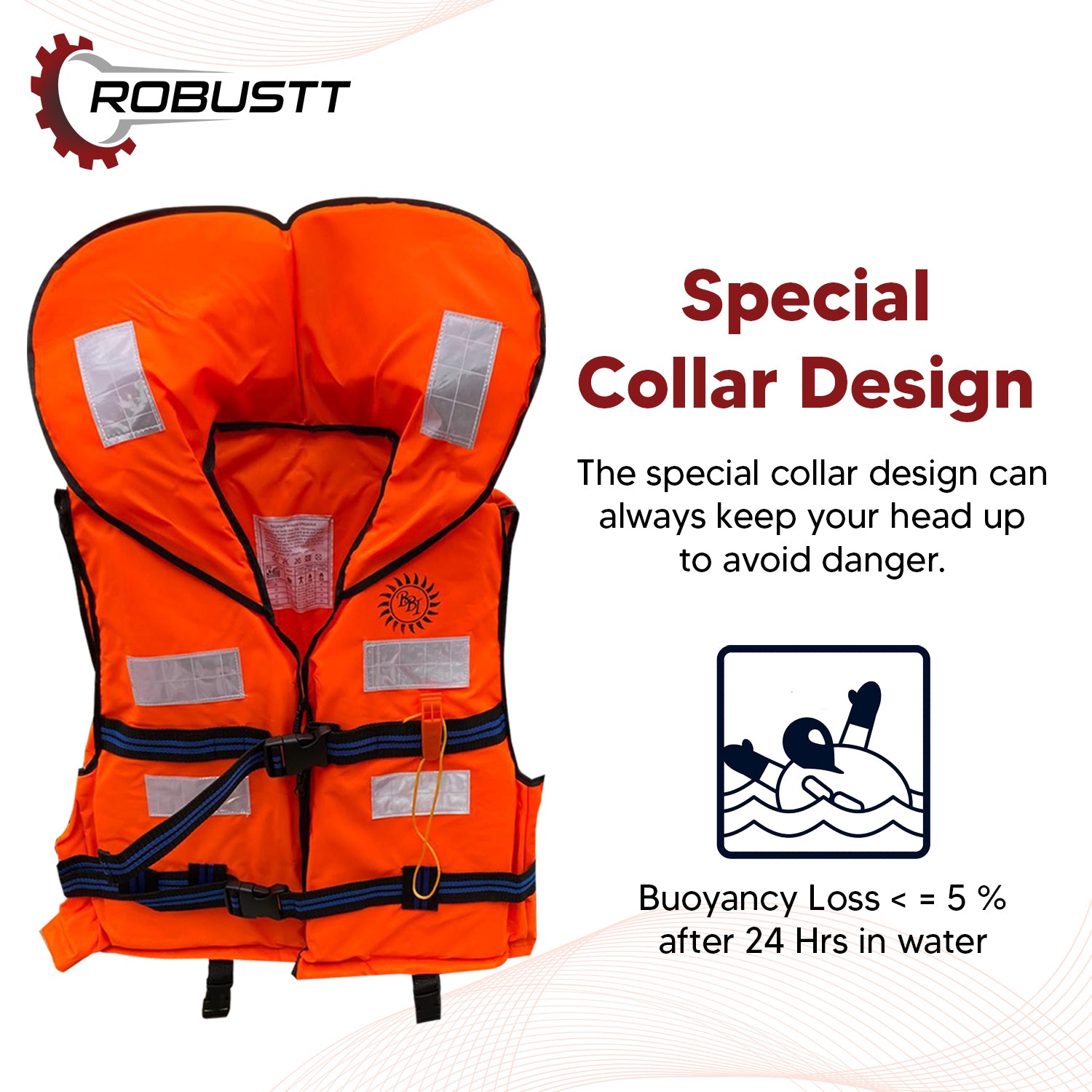Robustt Professional Life Jacket crafted with EPE foam, specifically designed for water safety. With a buoyancy loss of ≤ 5% after 24 hours in water, this jacket ensures reliable flotation in emergencies. The special collar design keeps your head above water, minimizing the risk of danger. Constructed with multiple layers of Ultralight EPE foam, it offers maximum flexibility while being water-repellent and resistant. It's important to note that this safety jacket reduces the risk of drowning by keeping the wearer afloat in water, making it an essential companion for aquatic activities where safety is paramount. Trust in the reliability and performance of our Professional Life Jacket for a secure water experience.