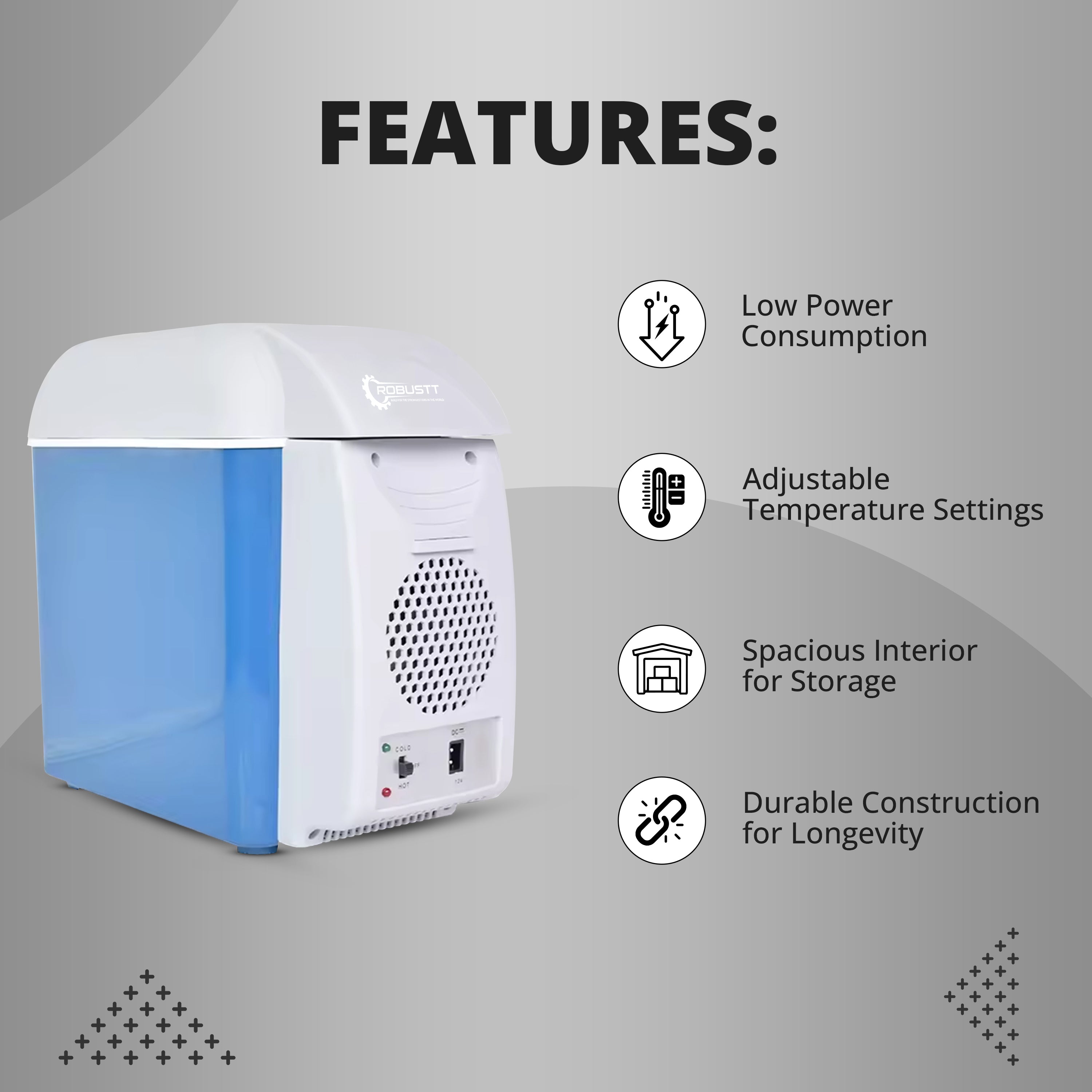 Introducing the Robustt car fridge, your ideal travel companion for chilled refreshments. With a 7.5-liter capacity and dual-mode temperature control, it keeps drinks cool or snacks warm effortlessly. Its low-noise operation ensures a peaceful journey, while its compact design makes it perfect for road trips and picnics. Enjoy convenience and freshness wherever you go with the Robustt car refrigerator.