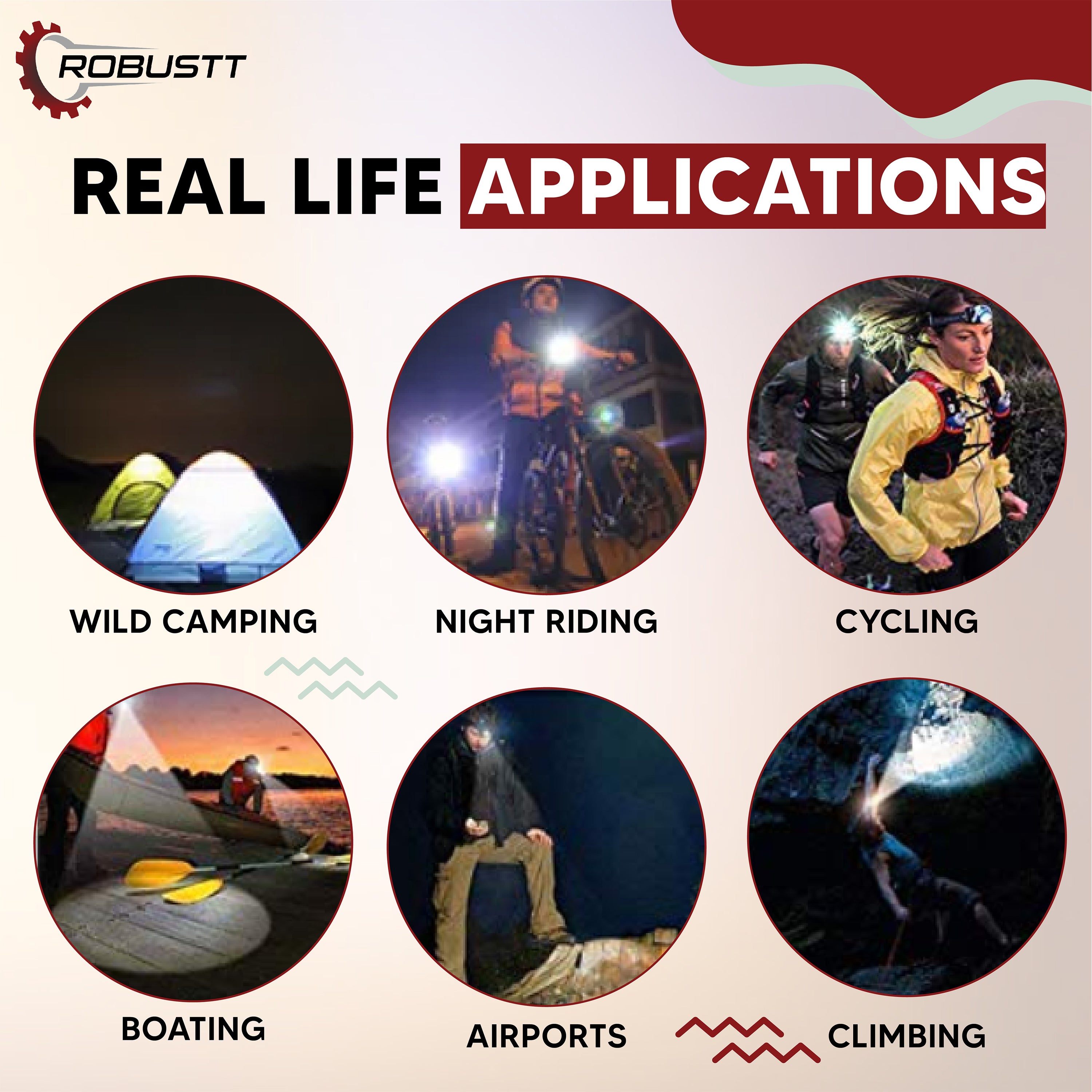 Ideal for night-time running, walking, cycling, hiking, repairing, night working, daily lighting use, caving, climbing, mountaineering, fishing, hunting, car repairing, DIY works, or emergency situations.