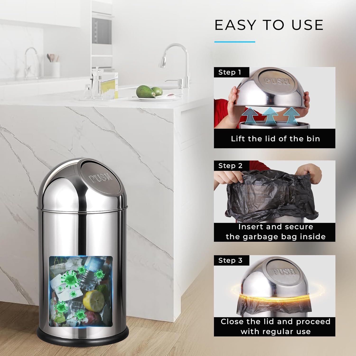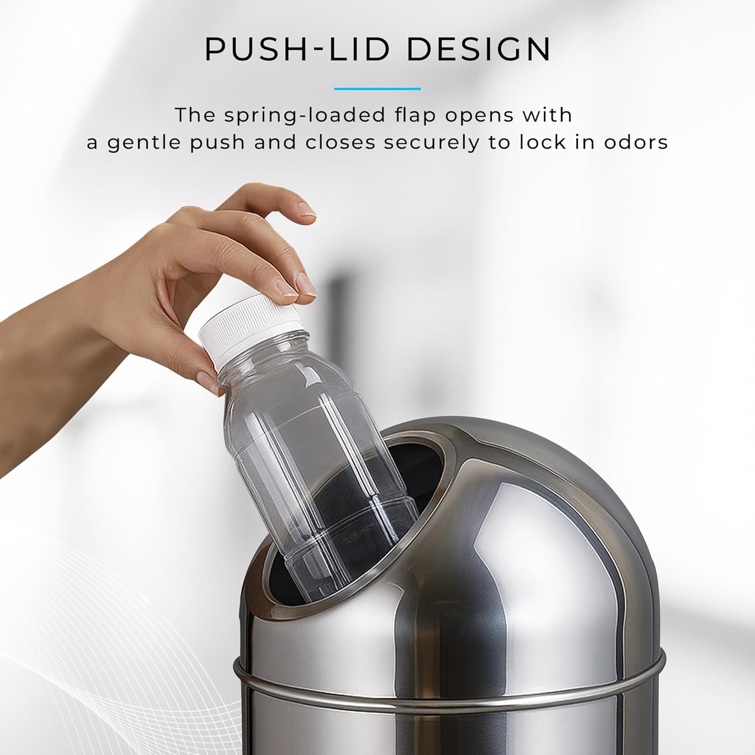 - Push-Lid Design: The bin features a spring-loaded push lid that opens with a light press and closes automatically after use. This smart design helps contain unpleasant odors inside the bin, keeping your space fresher and more hygienic.