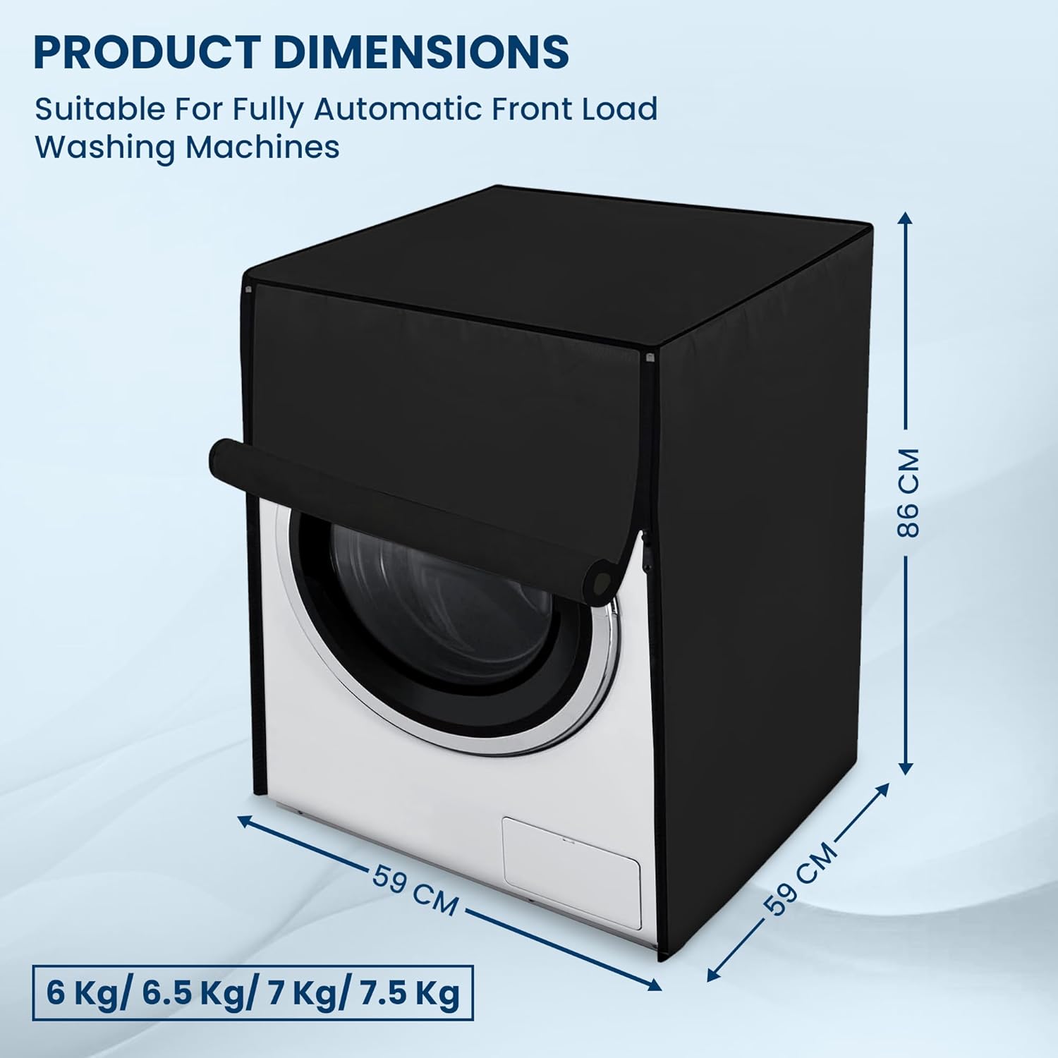 - Perfect Fit: With exact 59×59×86 cm dimensions, this cover is ideal for protecting fully automatic front load machines suitable washing machine cover for 6kg, 6.5 kg, 7kg, 7.5kg front load.