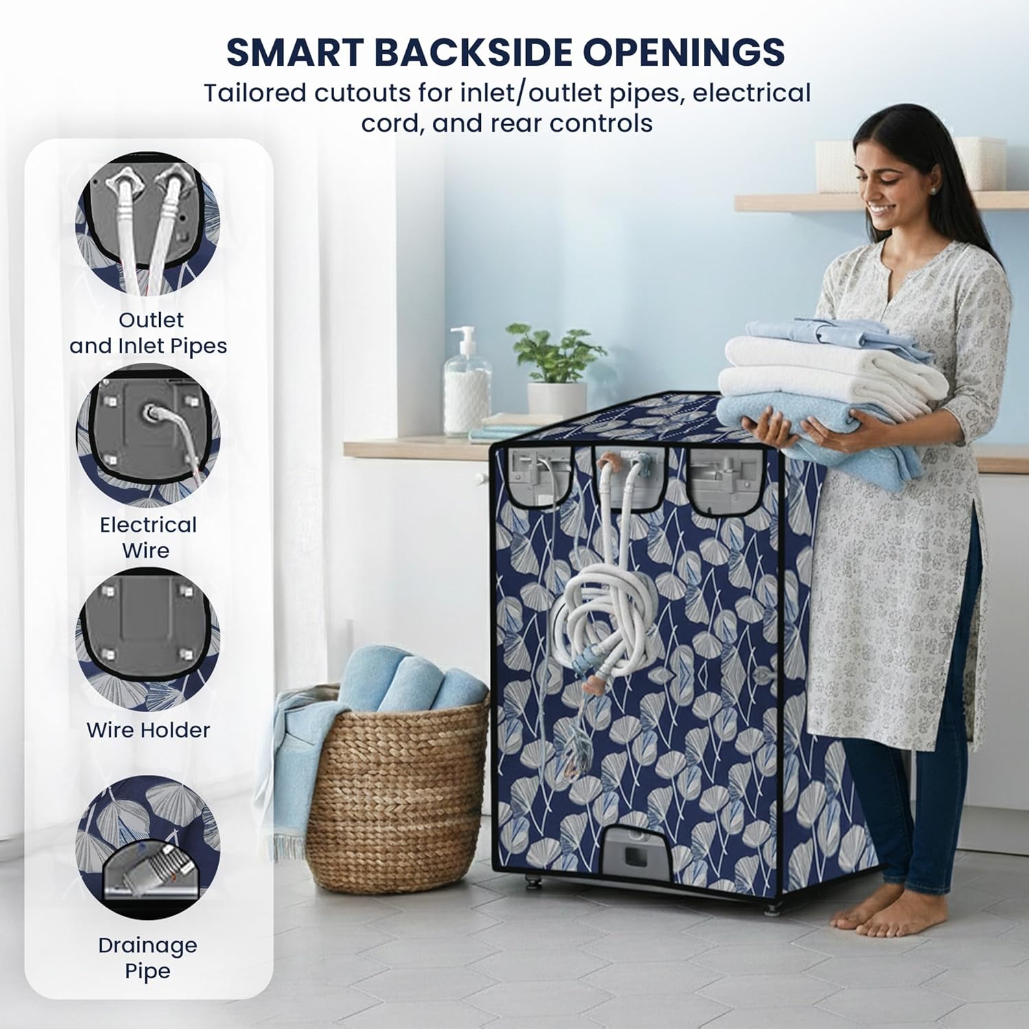 - Functional Backside Openings: Built with smart cutouts for water inlets, drain outlets, power cords, and rear buttons, this washing machine top load cover gives you full access to connections while the cover stays neatly in place.
