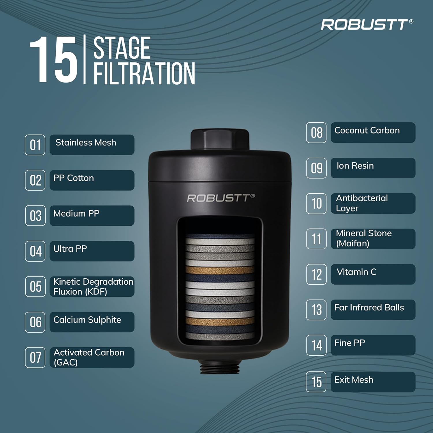 - 15-Stage Filtration – Featuring a 15 stage cartridge, this hard water softener purifies water through multiple layers including mineral stones, mesh filters, KDF, and more. Each stage works in synergy to reduce impurities, soften hard water, and remove odors. The result is visibly healthier skin and hair after every use.